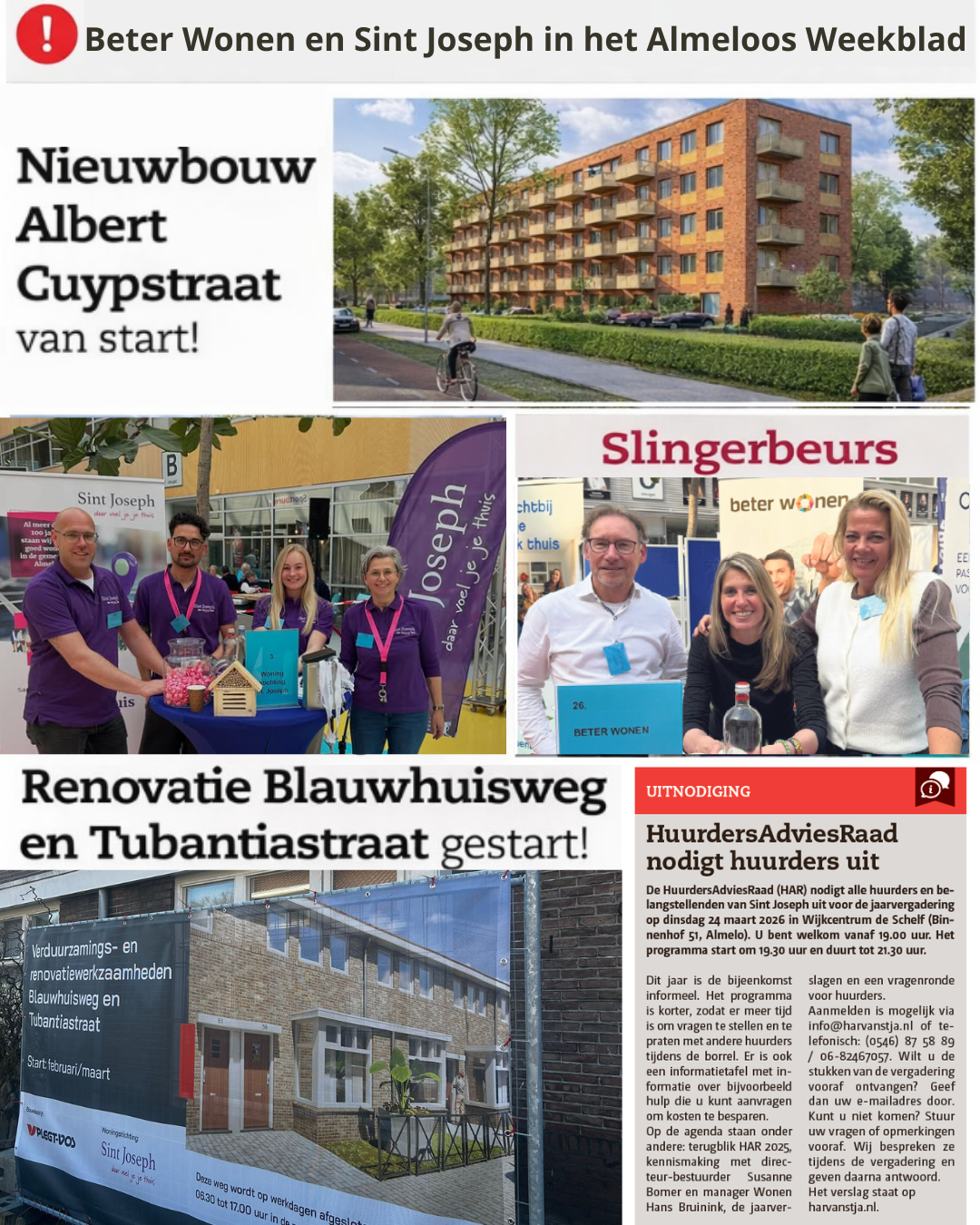 In het Almeloos Weekblad delen Sint Joseph en Beter Wonen samen nieuws uit Almelo. Zo lees je over de start van de bouw van 40 nieuwe appartementen aan de Albert Cuypstraat, waar Beter Wonen werkt aan moderne en energiezuinige woningen.