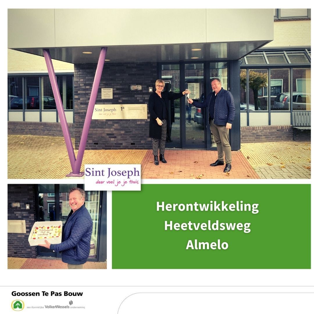 De kantoren met werkplaats van woningcorporatie Sint Joseph aan de Heetveldsweg stonden sinds maart dit jaar te koop. Op maandag 15 november vond de officiële overdracht plaats. Claudia Beumer (directeur-bestuurder Sint Joseph) overhandigde de sleutels aan Dick Nijkamp (directeur Goossen Te Pas Bouw).