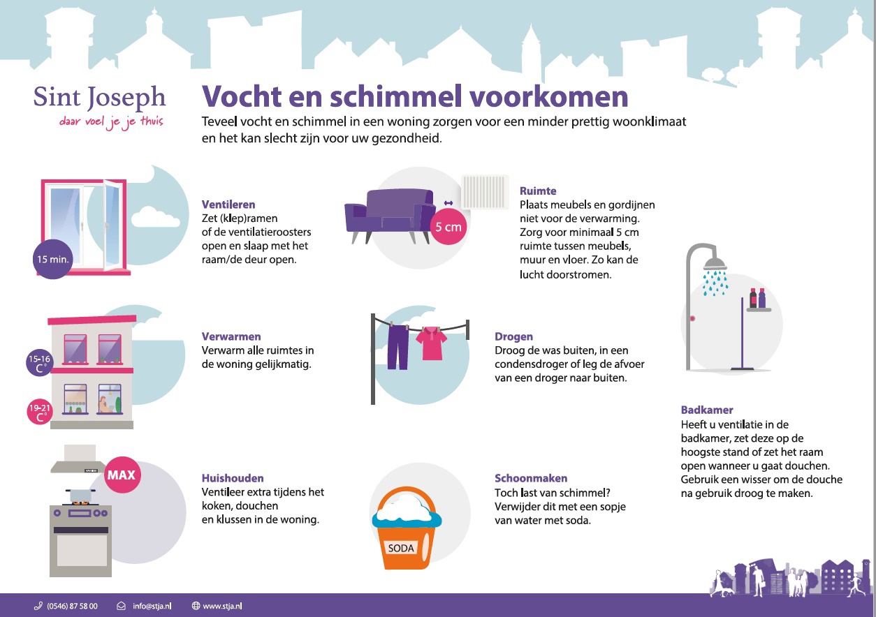 Een vochtige woning is ongezond en zorgt voor een onaangenaam klimaat. In veel gevallen kunt u als bewoner problemen met vocht en schimmel voorkomen. Dat doet u bijvoorbeeld door de woning goed te ventileren, gelijkmatig te verwarmen en de doucheruimte na gebruik droog te maken met een wisser.