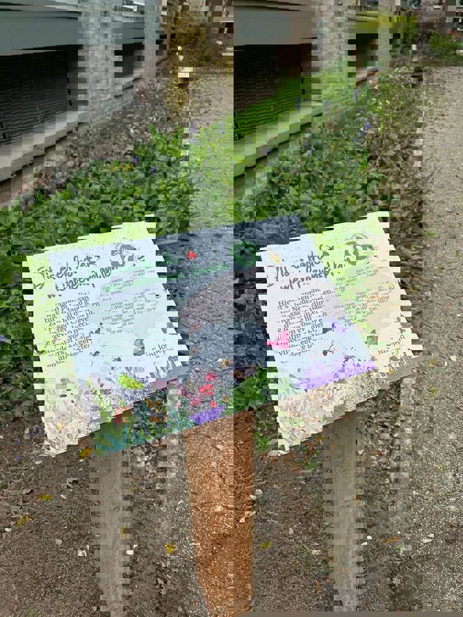 Om meer te vertellen over wat er allemaal groeit, bloeit en leeft, zijn er verschillende tuinborden geplaatst. Hier lees je hoe deze tuin bijdraagt aan een groene, gezonde leefomgeving.