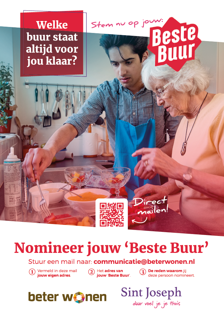 Ook dit jaar, voor de zevende keer op rij, zetten Sint Joseph en Beter Wonen de Beste Buur in de schijnwerpers. Deze titel is bedoeld om de stille krachten in onze buurten en wijken te eren: diegenen die altijd klaarstaan voor anderen. Huurders van Sint Joseph of Beter Wonen kunnen hun Beste Buur gedurende de maanden juli en augustus nomineren. Alle genomineerden krijgen een bezoekje op Nationale Burendag, zaterdag 28 september.