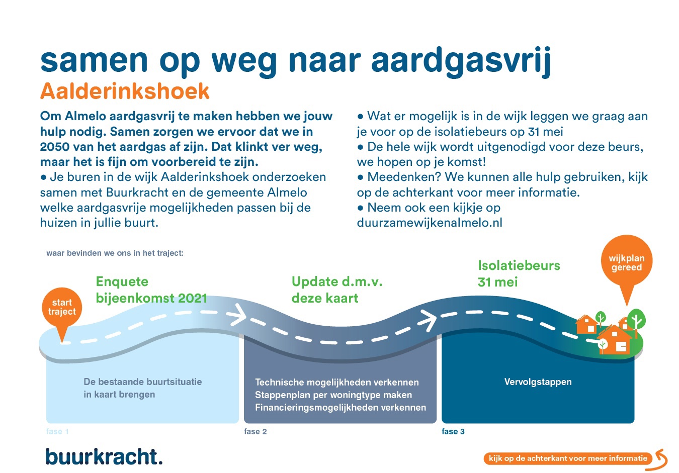 De gemeente Almelo heeft een subsidie gekregen vanuit het Programma Aardgasvrije Wijken (PAW). Deze subsidie zet de gemeente in om delen van de wijk Aalderinkshoek aardgasvrij te maken. Op dit moment onderzoekt de gemeente met verschillende partijen (waaronder woningcorporaties en Cogas) welke mogelijkheden er zijn om de wijk aardgasvrij te maken. Dit doen zij samen met de bewoners van deze wijk. Met het Buurtteam kunnen bewoners (huurders en kopers) meepraten over het aardgasvrij maken van woningen/gebouwen.