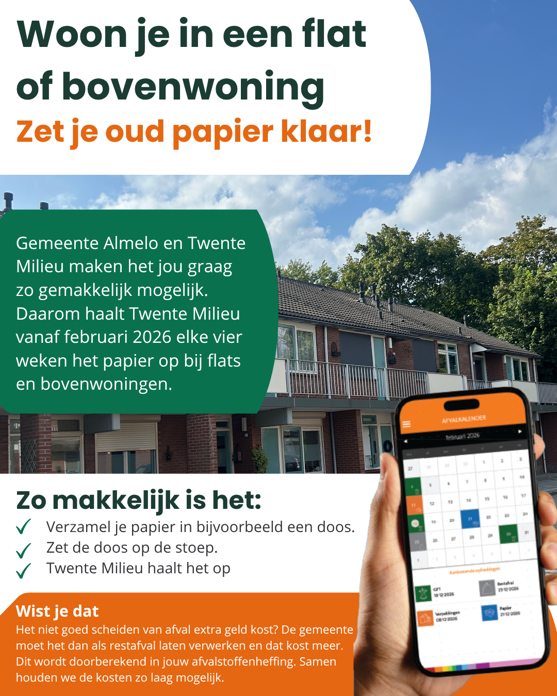 Vanaf februari 2026 haalt Twente Milieu elke 4 weken papier op bij flats en bovenwoningen.